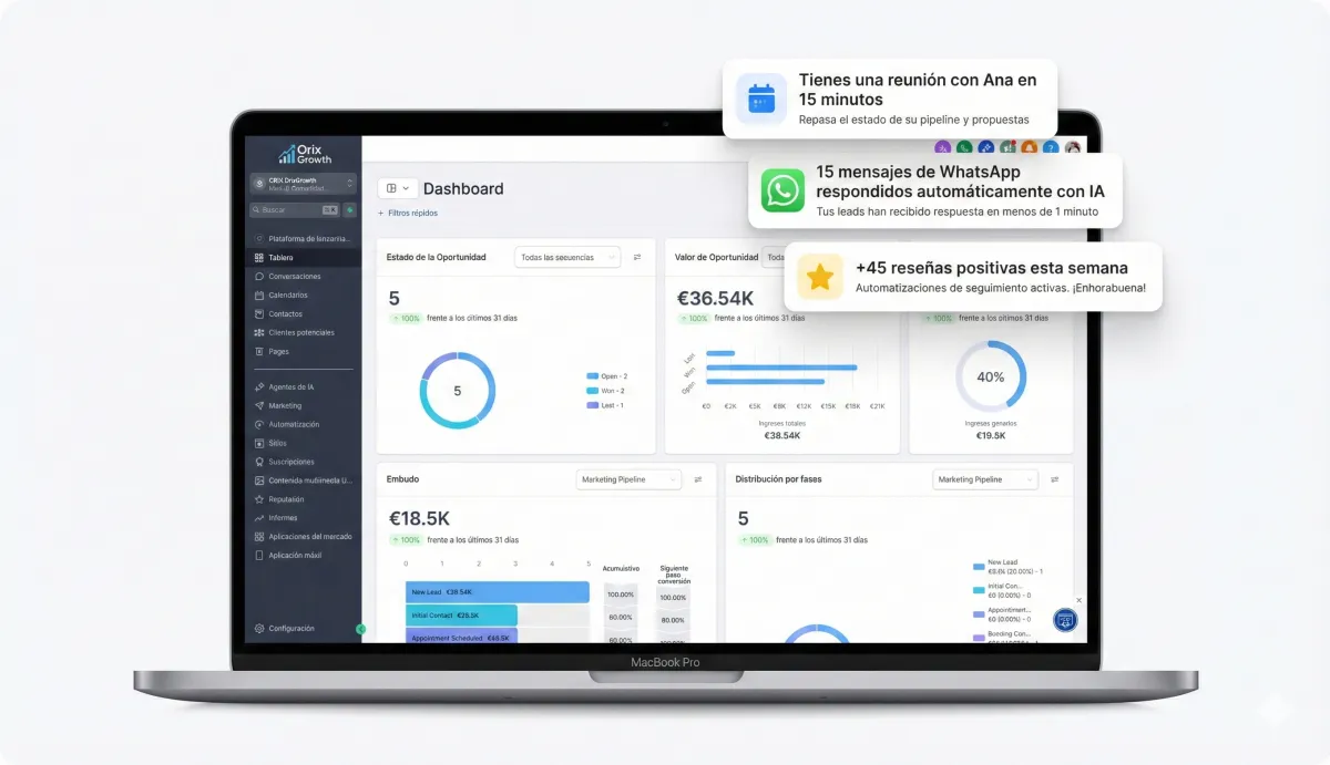 Un único sistema donde tienes embudo de ventas, webs y landings, formularios, seminarios y cursos, agendas, WhatsApp, Instagram, email, SMS y llamadas integradas, con una base de datos 360º siempre actualizada en tiempo real.